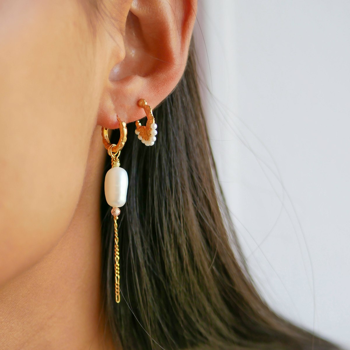 Adeline øreringen udstråler i den grad elegance på sin helt egen unikke måde. Adeline består af en underskøn barok perle, en rå hoop, og zirkoner i sarte farver samt en figarokæde. Denne kombination gør øreringen cool, eksklusiv og elegant på samme tid. Adeline er uundværlig til en festlig anledning eller en hverdag, der mangler lidt ekstra. Vedhængene på hoopen kan tages af, og du kan dermed bruge den på fire forskellige måder.