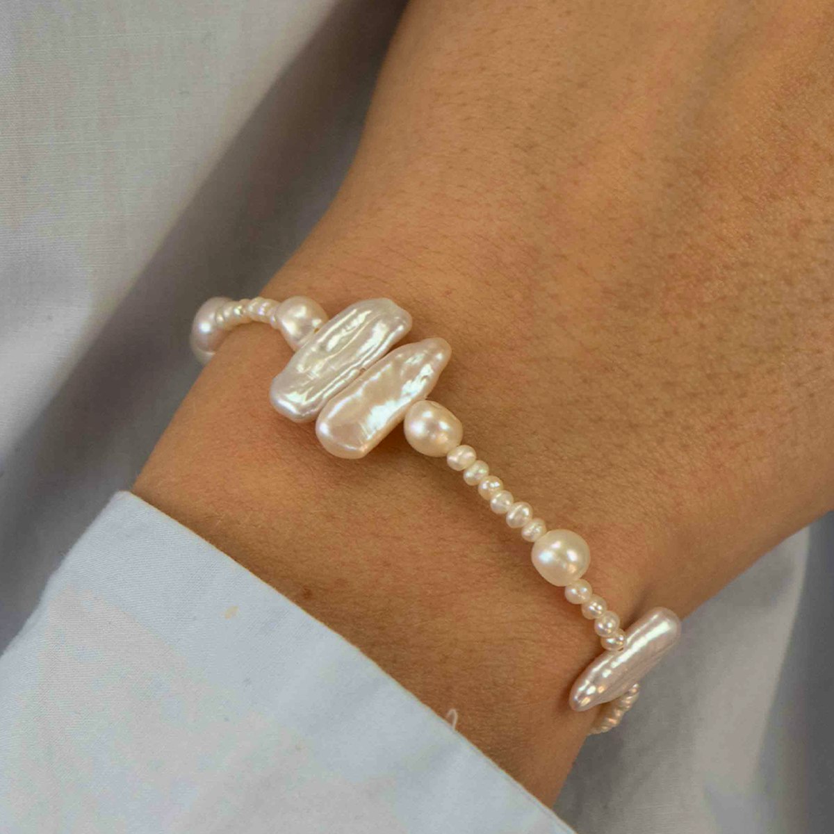 Armbåndet Vera er smukt og tidløst, men samtidig anderledes og følger modens tendenser med sine naturlige ferskvandsperler i forskellige former.