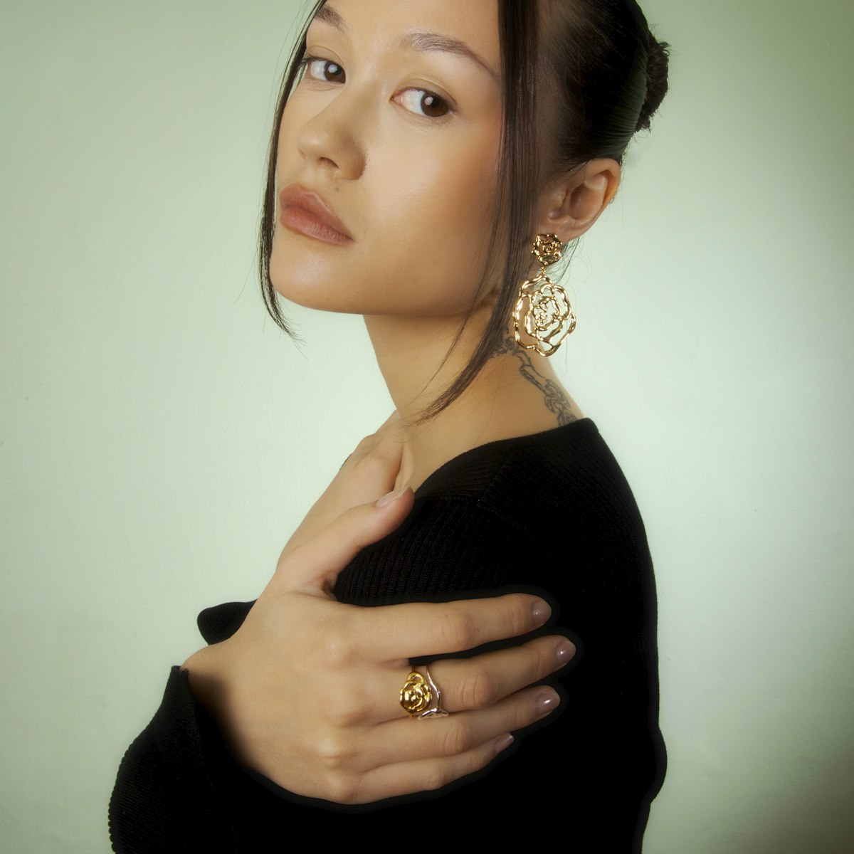 Denne smukke ring er omhyggeligt designet med en organisk og snoet rose, der elegant følger fingerens kurve. Den snoede form på rosen skaber en unik og kunstnerisk æstetik, der tilføjer et strejf af elegance og skønhed til ringen. Samtidig er ringskinnen også udformet i en snoet struktur, hvilket giver et harmonisk og sammenhængende udtryk.
