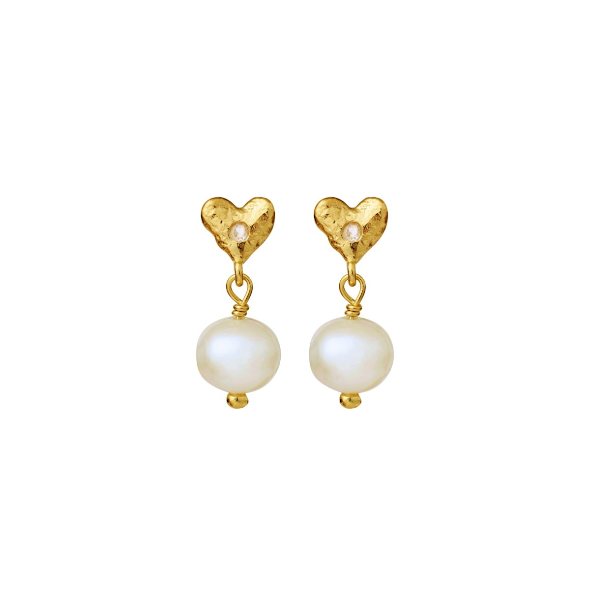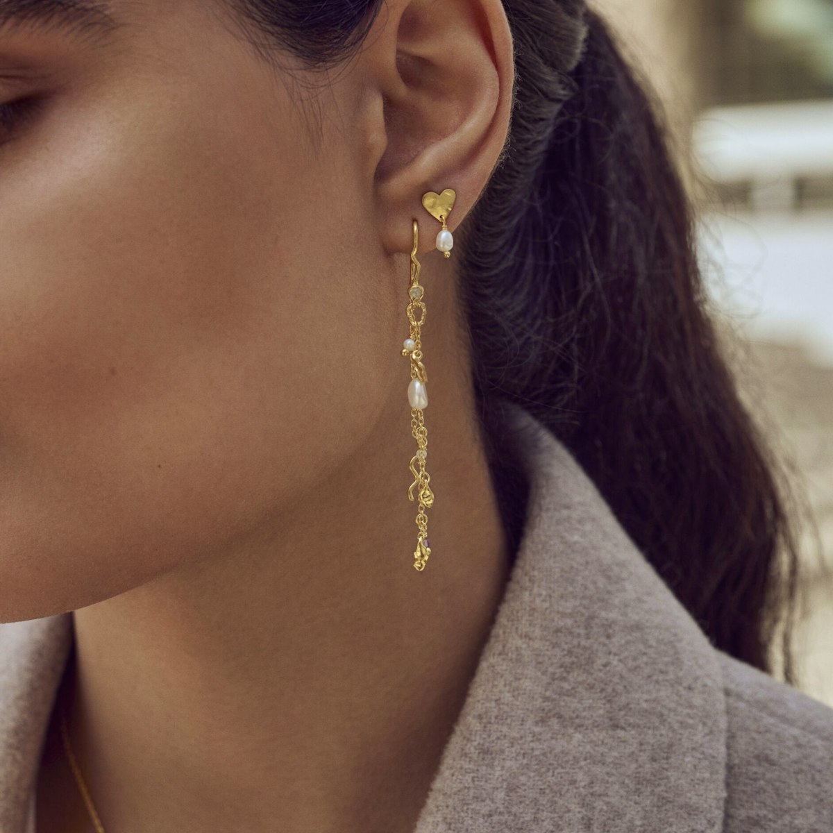 Alia øreringene er et smykke, der indkapsler essensen af hverdagskærlighed og elegance. Med deres organisk formede hjerter, prydet med strålende regnbue månesten i centrum, tilføjer disse øreringe et unikt og kunstnerisk præg til dit look. Den dryppende ferskvandsperle tilføjer en ekstra dimension af charme og lethed, som gør disse smykker til det perfekte valg for enhver anledning.