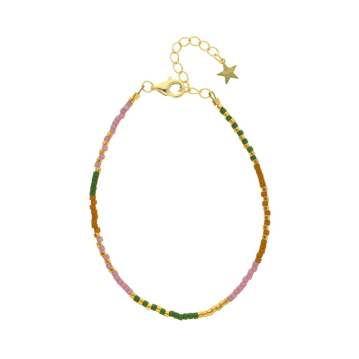 Nanna Green Multi Bracelet fra Nuni Copenhagen er et håndlavet perlearmbånd i 24 karat forgyldt genanvendt sterlingsølv 925 og glasperler i grønne og multifarvede nuancer. Farverne er friske, levende og perfekt afstemt, så armbåndet både kan fungere som et farverigt statement eller en underspillet detalje, alt efter hvordan du styler det. Det er et smykke, der emmer af personlighed og kreativitet – designet til kvinder, der vil bære farver med selvtillid.