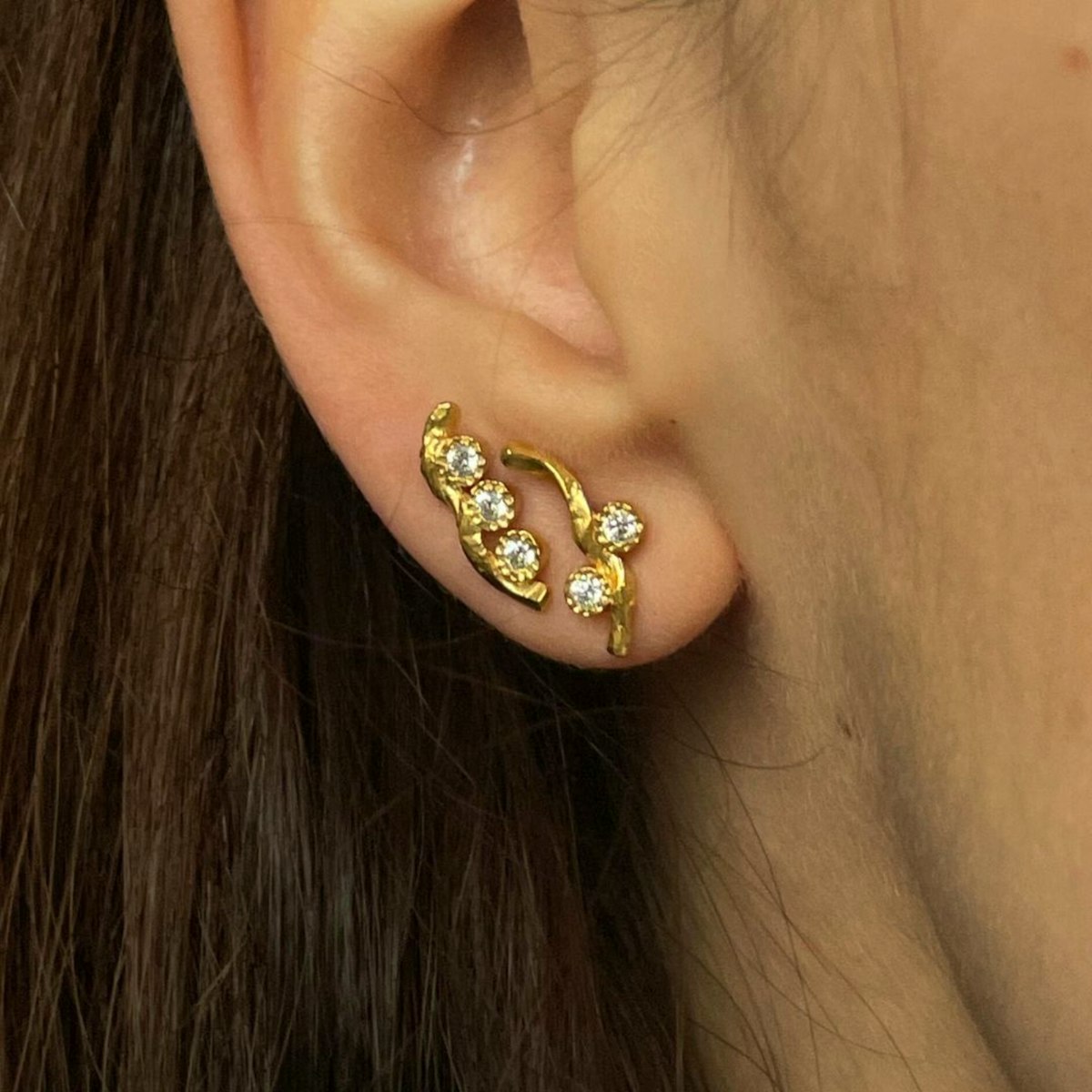 Smuk, langstrakt ørering med komplekse detaljer, der fremhæver guldet. Ørestikken er dekoreret med tre smukke ædelsten.